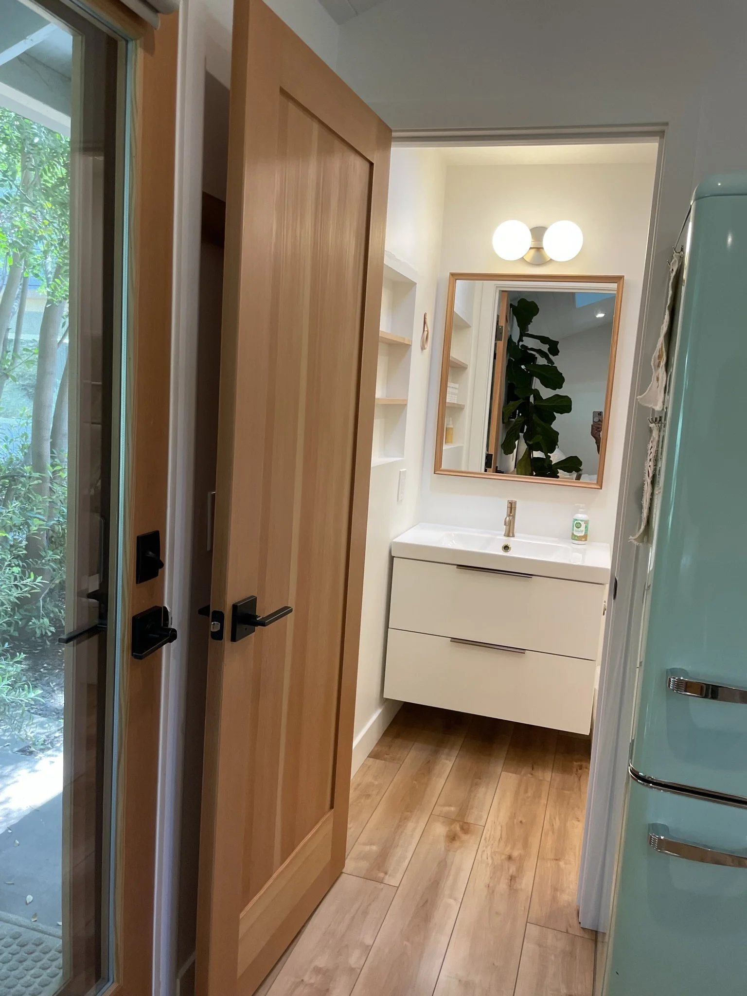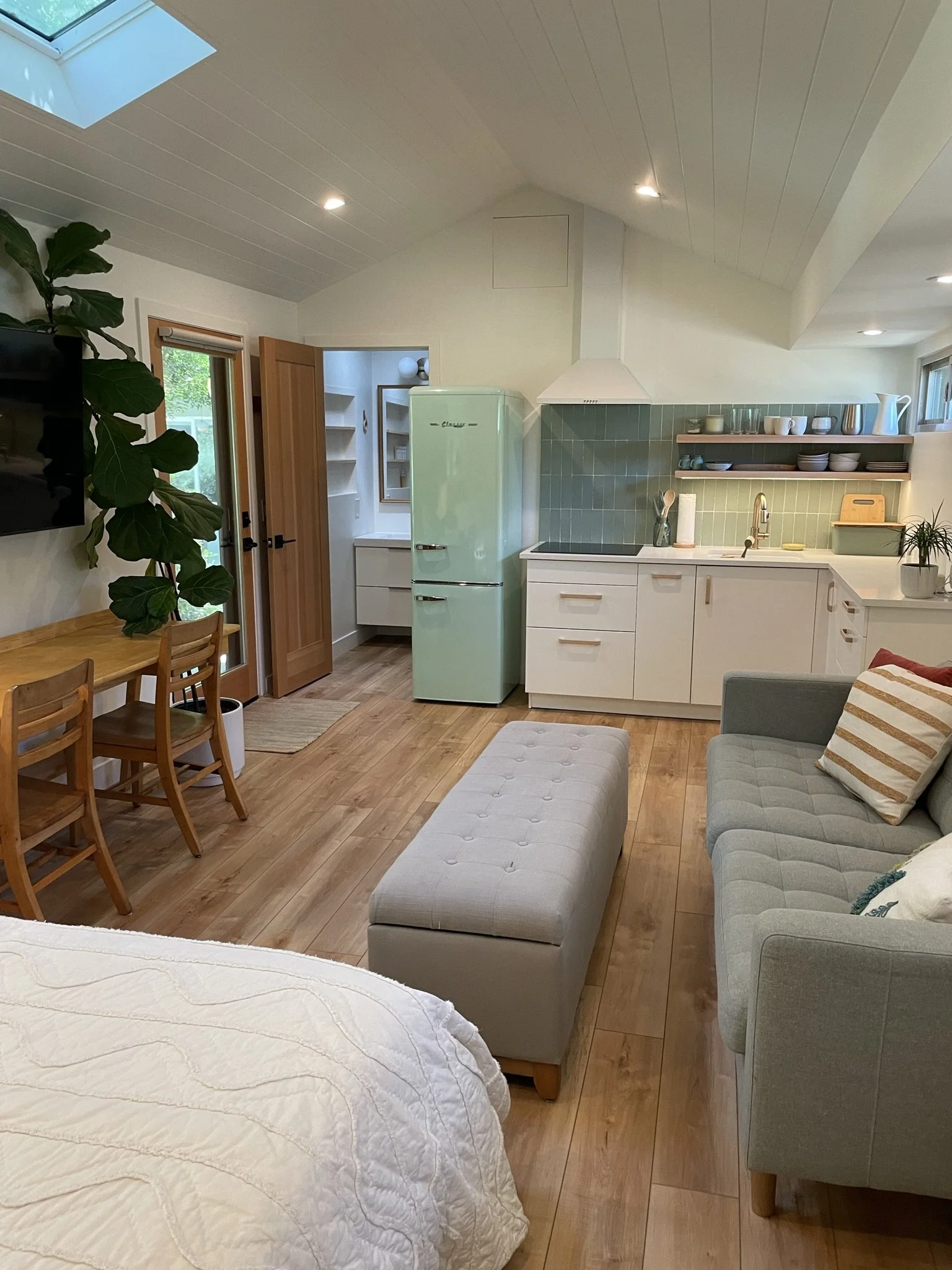 Kitchenette with a fridge, electric kettle, induction stove, and toaster oven.