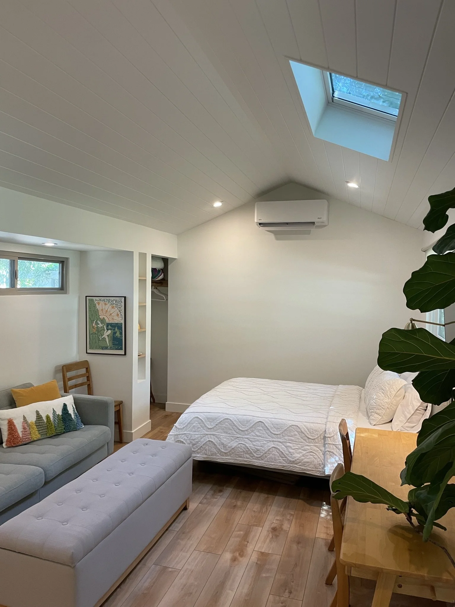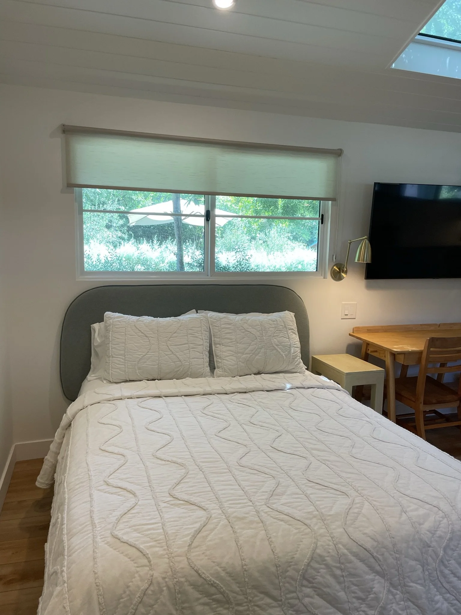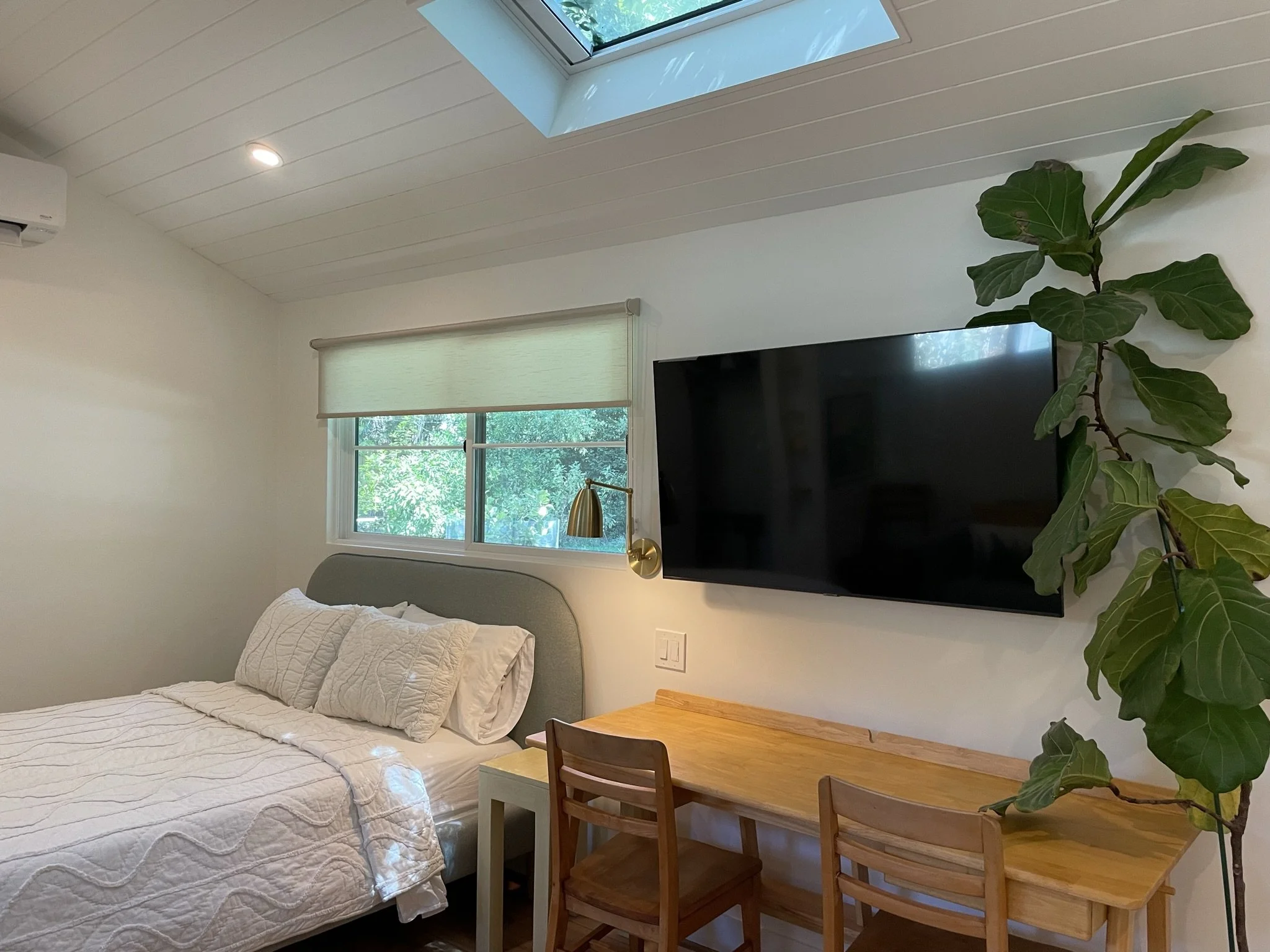 Living area with a full-size sofa, desk, large smart TV, and Wi-Fi.